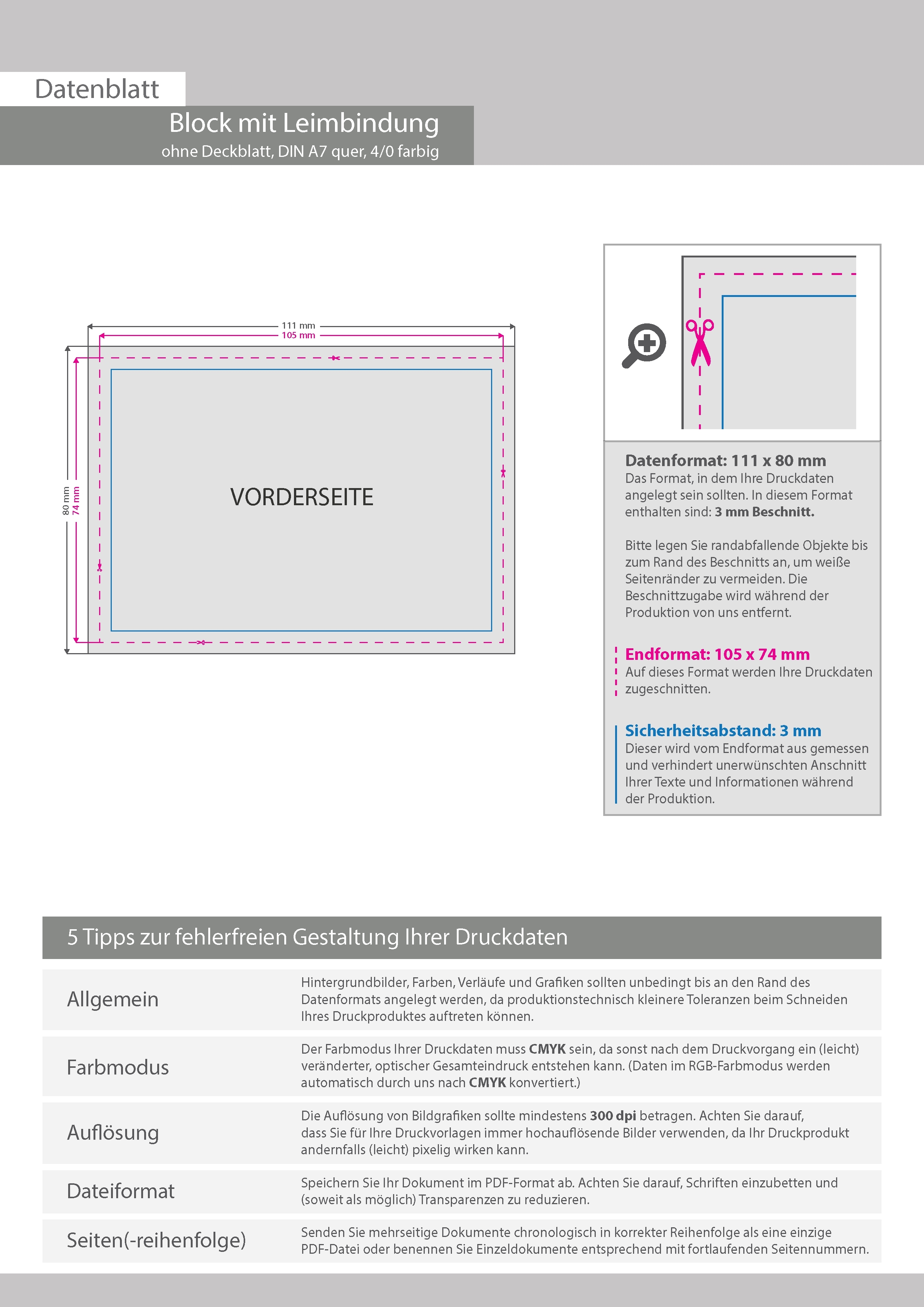 Block mit Leimbindung, DIN A7 quer, 200 Blatt, 4/0 farbig einseitig bedruckt