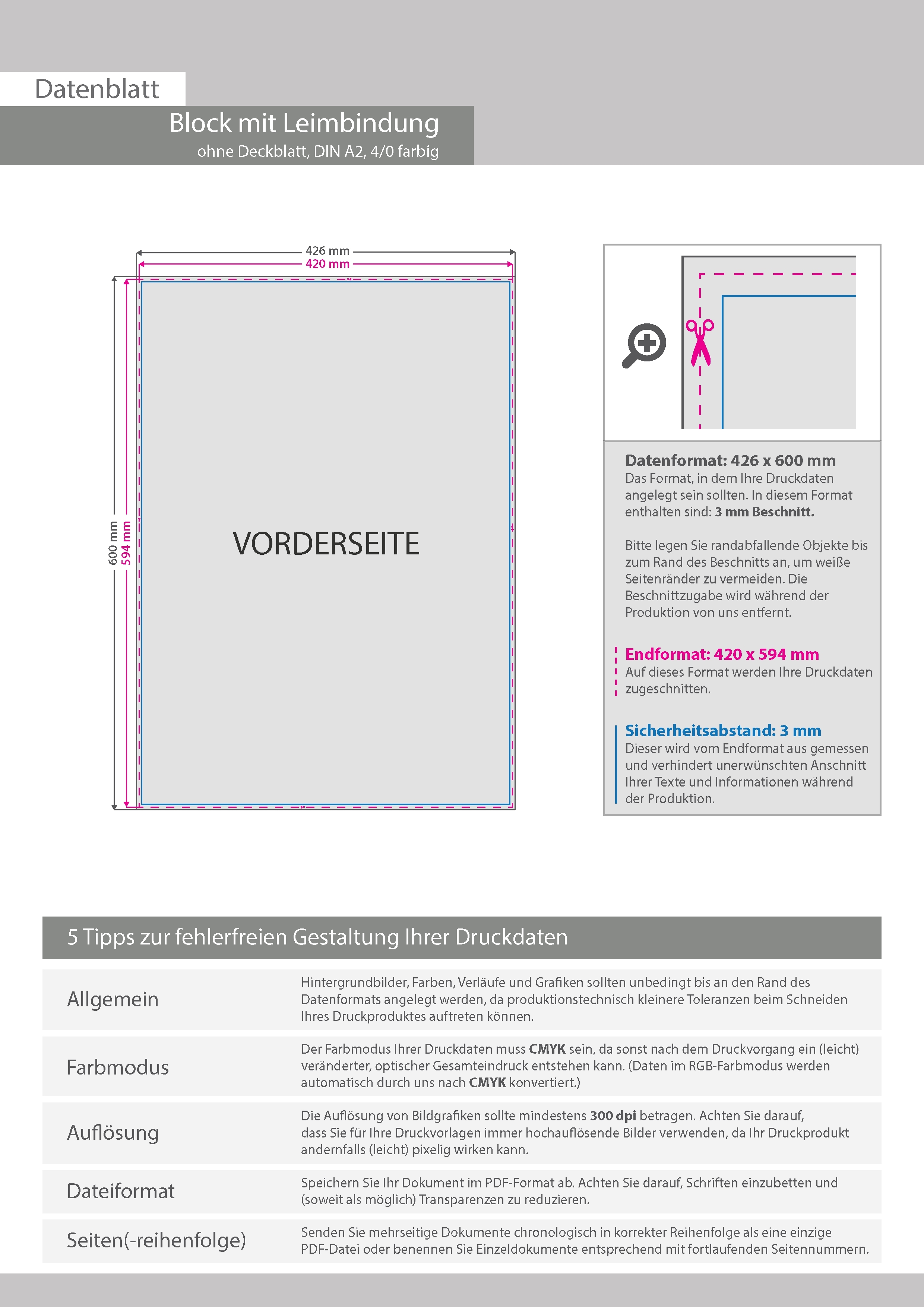 Block mit Leimbindung, DIN A2, 25 Blatt, 4/0 farbig einseitig bedruckt
